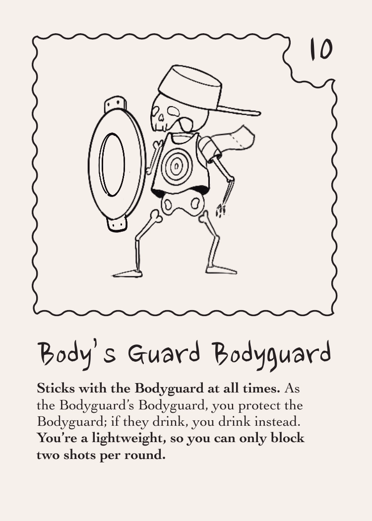 Stays glued to the Bodyguard. If the Bodyguard drinks, you drink instead. Can only block two shots per round β choose wisely.