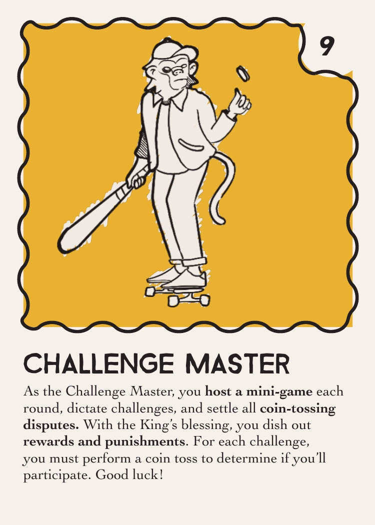 Runs one challenge per round, settles coin-toss disputes, and assigns rewards or punishments with the King's approval. Each challenge includes a coin toss to see if the Challenge Master must participate.