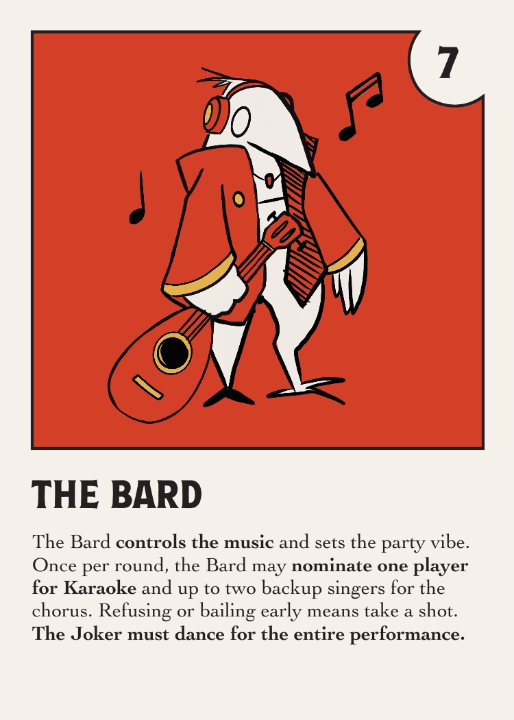 The Bard controls the music and once per round may nominate a player for Karaoke, plus up to two backup singers. Refusal or quitting early results in punishment. The Joker must dance the entire performance.