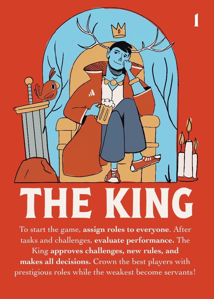 The King assigns roles, approves challenges and rules, resolves disputes, and decides who thrives or suffers at the end of each round. Strong performers earn better roles; weak ones become servants. Absolute power, questionable judgment.